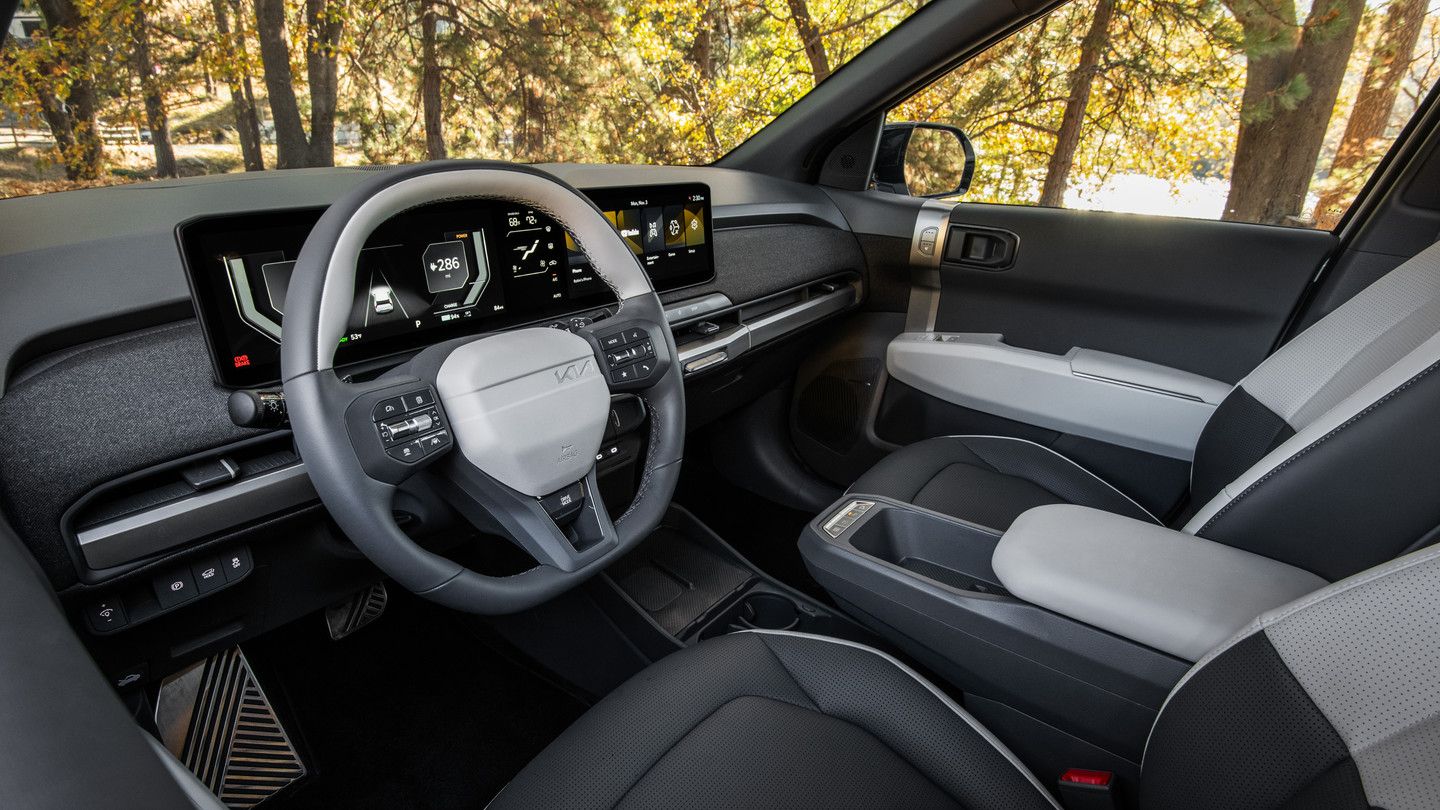 The cabin is where the EV3 makes its strongest case. The standard panoramic display spans nearly 30 inches, combining a 12.3-inch instrument cluster, 5.3-inch HVAC display, and 12.3-inch infotainment touchscreen. This Connected Car Navigation Cockpit (ccNC) system debuted in the EV9 and supports over-the-air software updates.